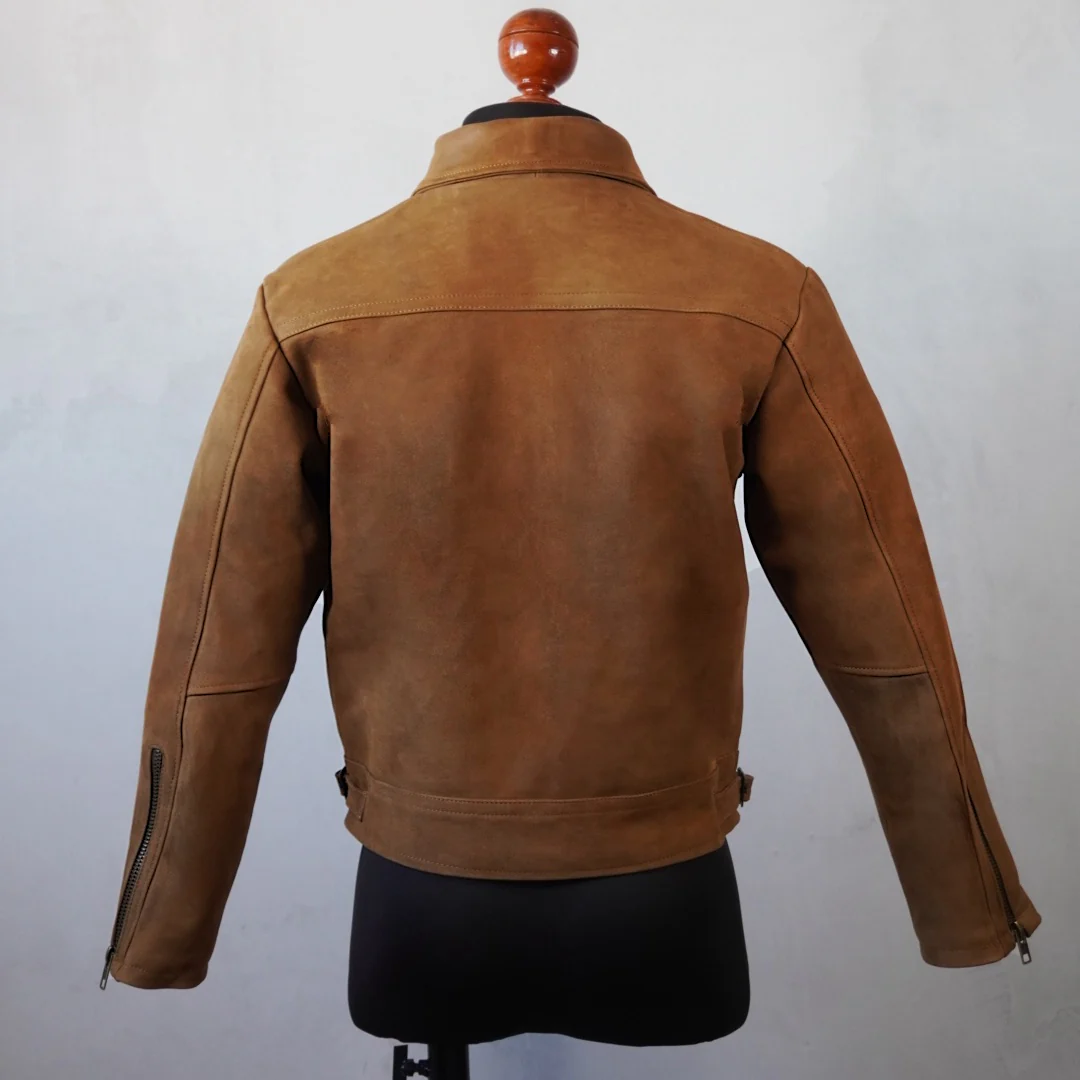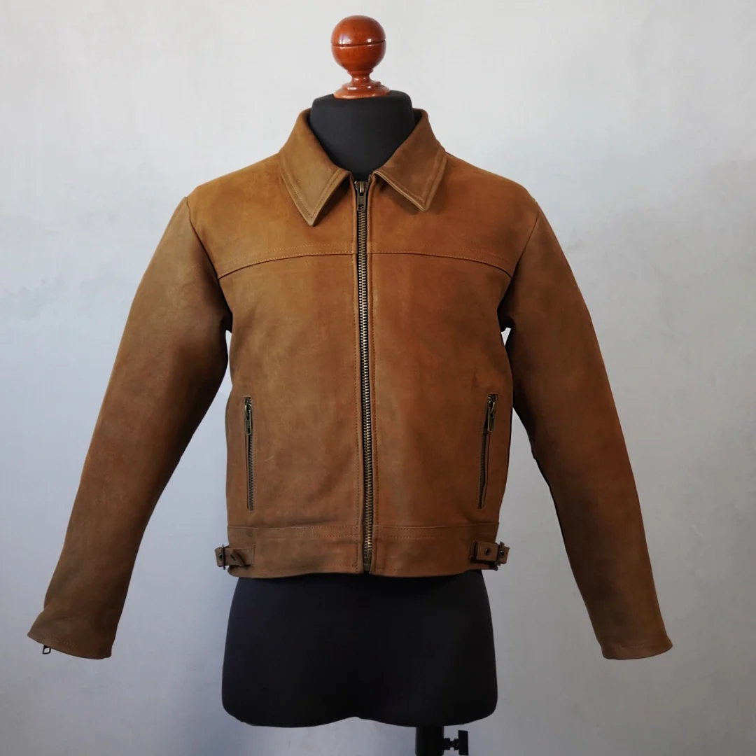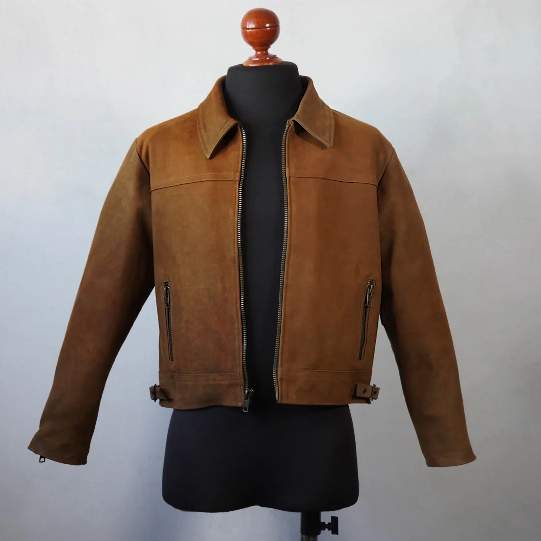«Esta chamarra de piel genuina de corte croped es perfecta para cualquier atuendo. Su color arena en piel de borrego nobuck te mantendrá abrigado y elegante en cualquier ocasión. Confeccionada con materiales de alta calidad, esta chamarra es duradera y resistente para un uso diario. Añadirá un toque de estilo a tu armario.»