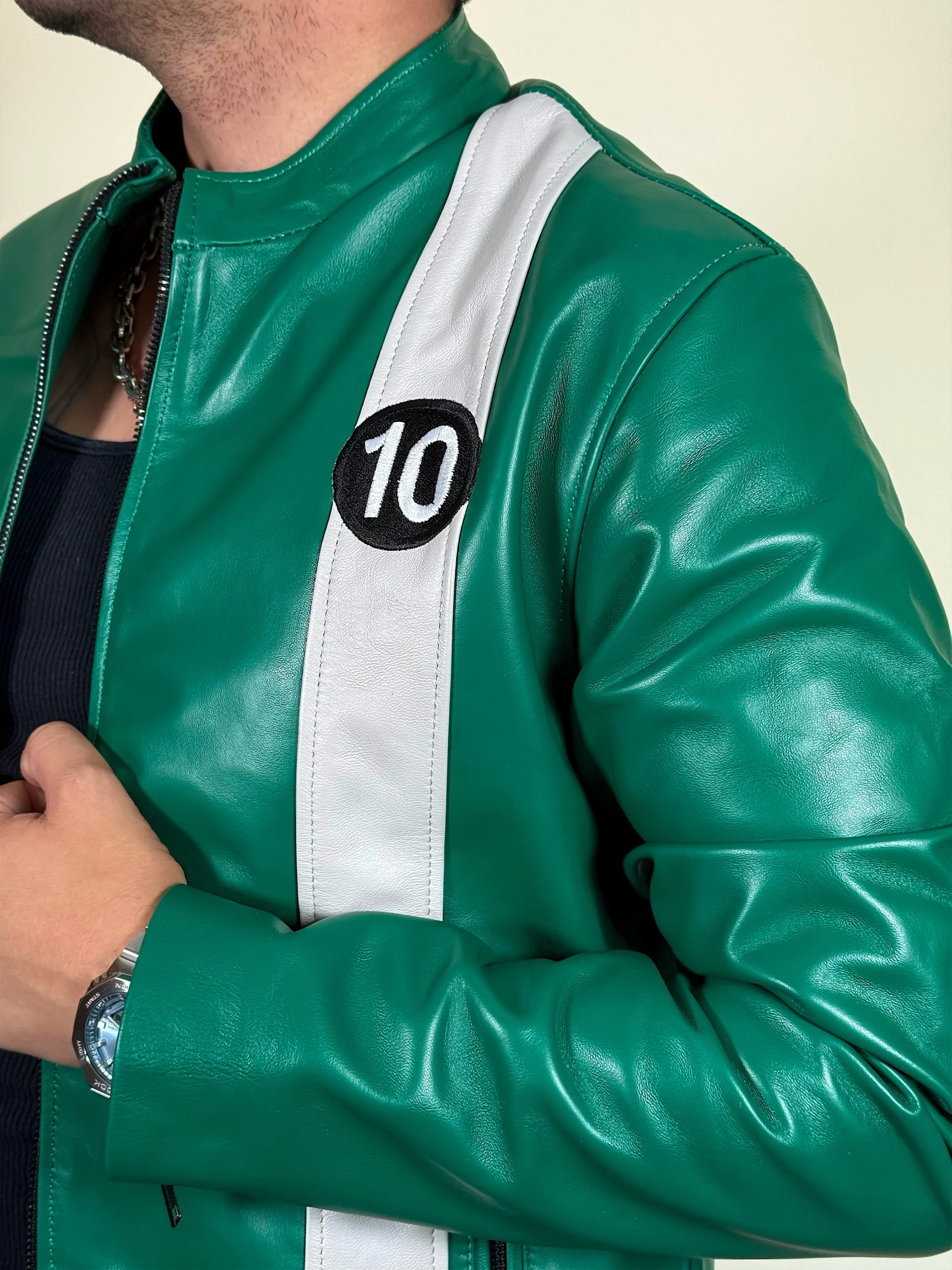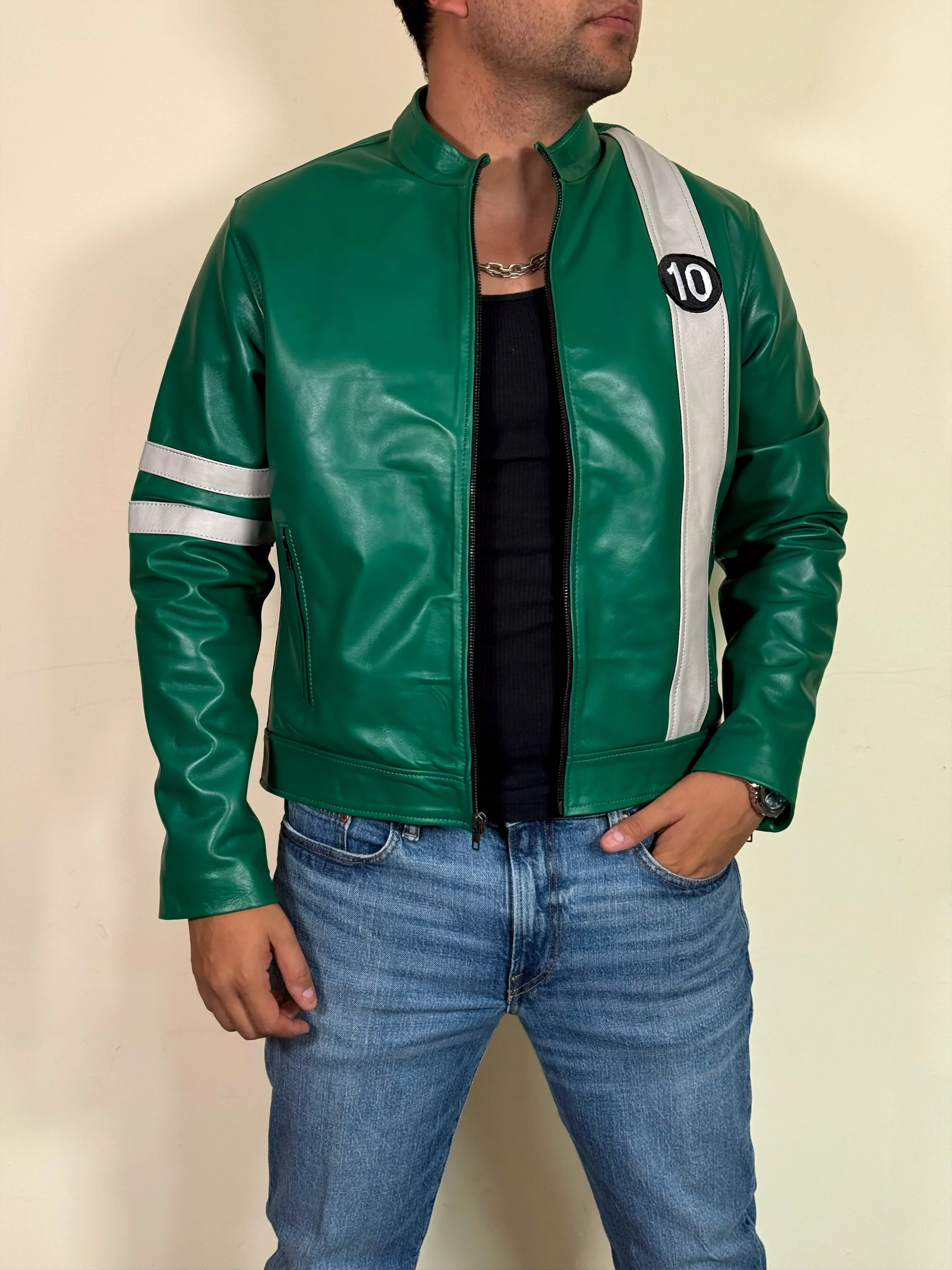 La chamarra de piel genuina de borrego verde basada en el personaje de Benjamín Tennyson es perfecta para los amantes de la serie Ben 10. Con su diseño único y material de alta calidad, esta chamarra no solo te mantiene abrigado, sino que también te permite lucir como tu héroe favorito. ¡Hazte con ella y conviértete en un verdadero fan de Ben 10!