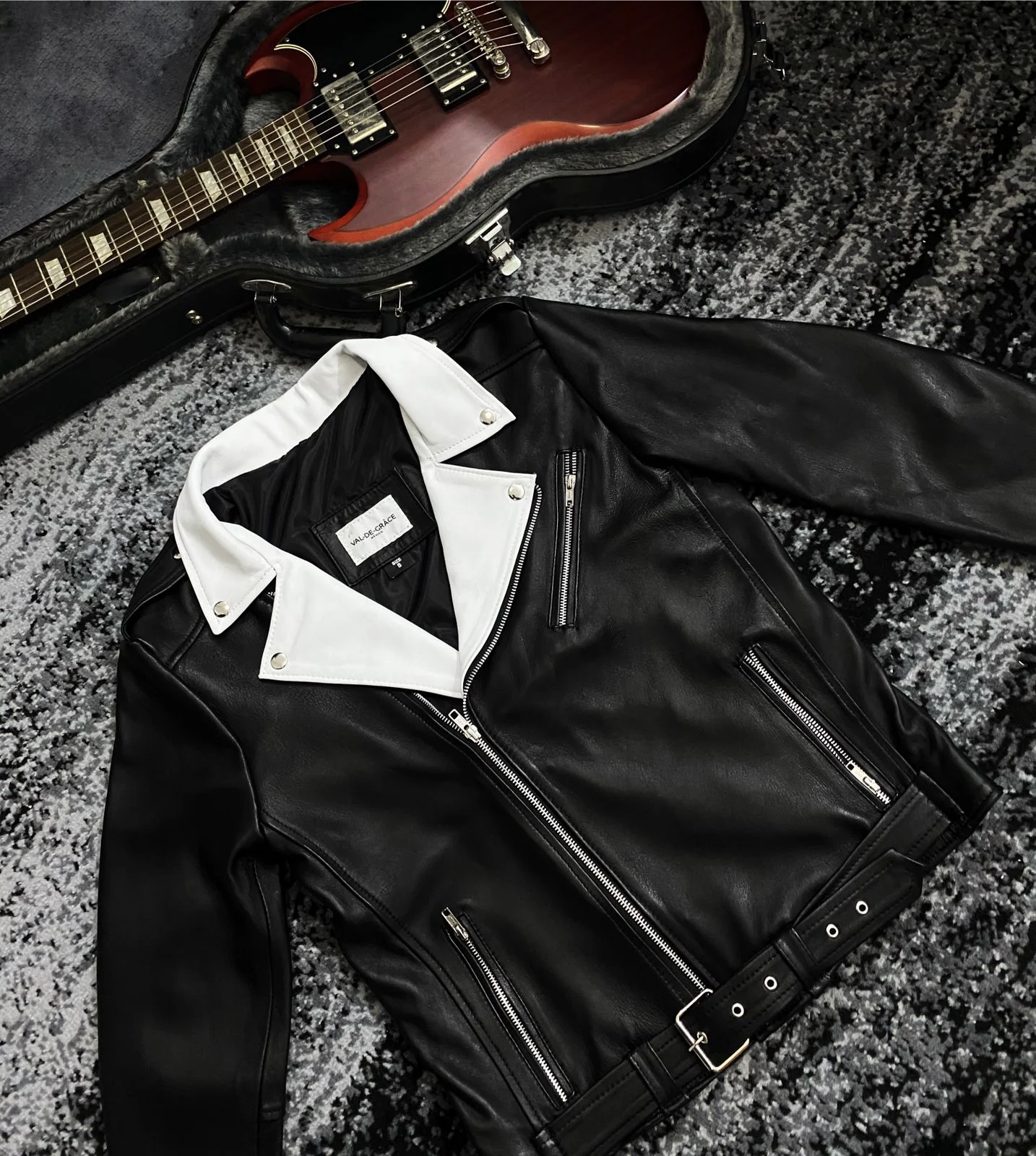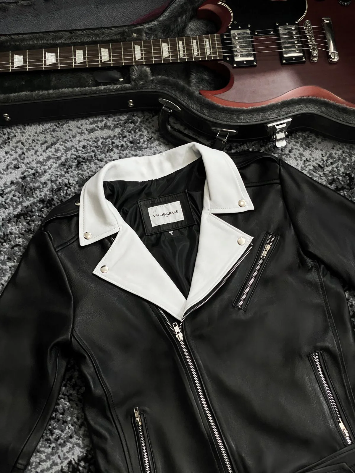 Chamarra tipo biker con cuello blanco