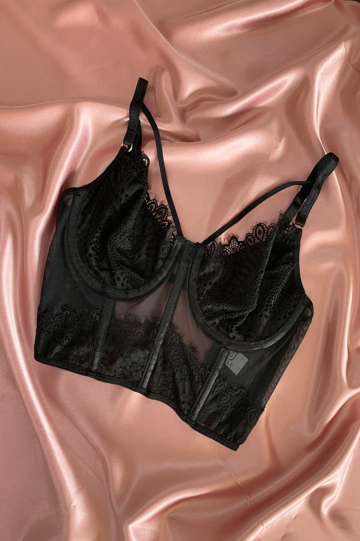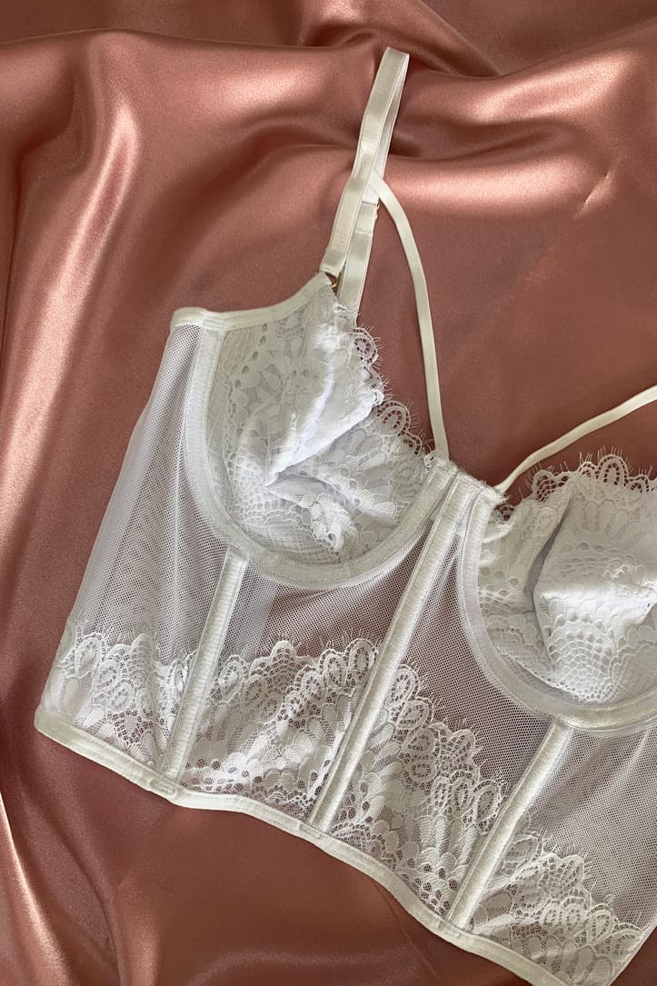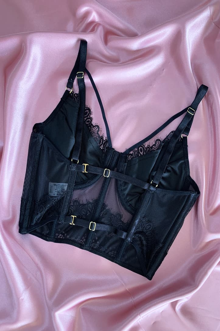 Crop top elaborado de encaje luxury y licra, sus copas cuentan con forro de algodón lo cual te brindan mayor comodidad y horma, sus cargaderas son graduables, todos sus herrajes son dorados y la espalda es totalmente ajustable. un Crop Top que hará inolvidable tu outfit.