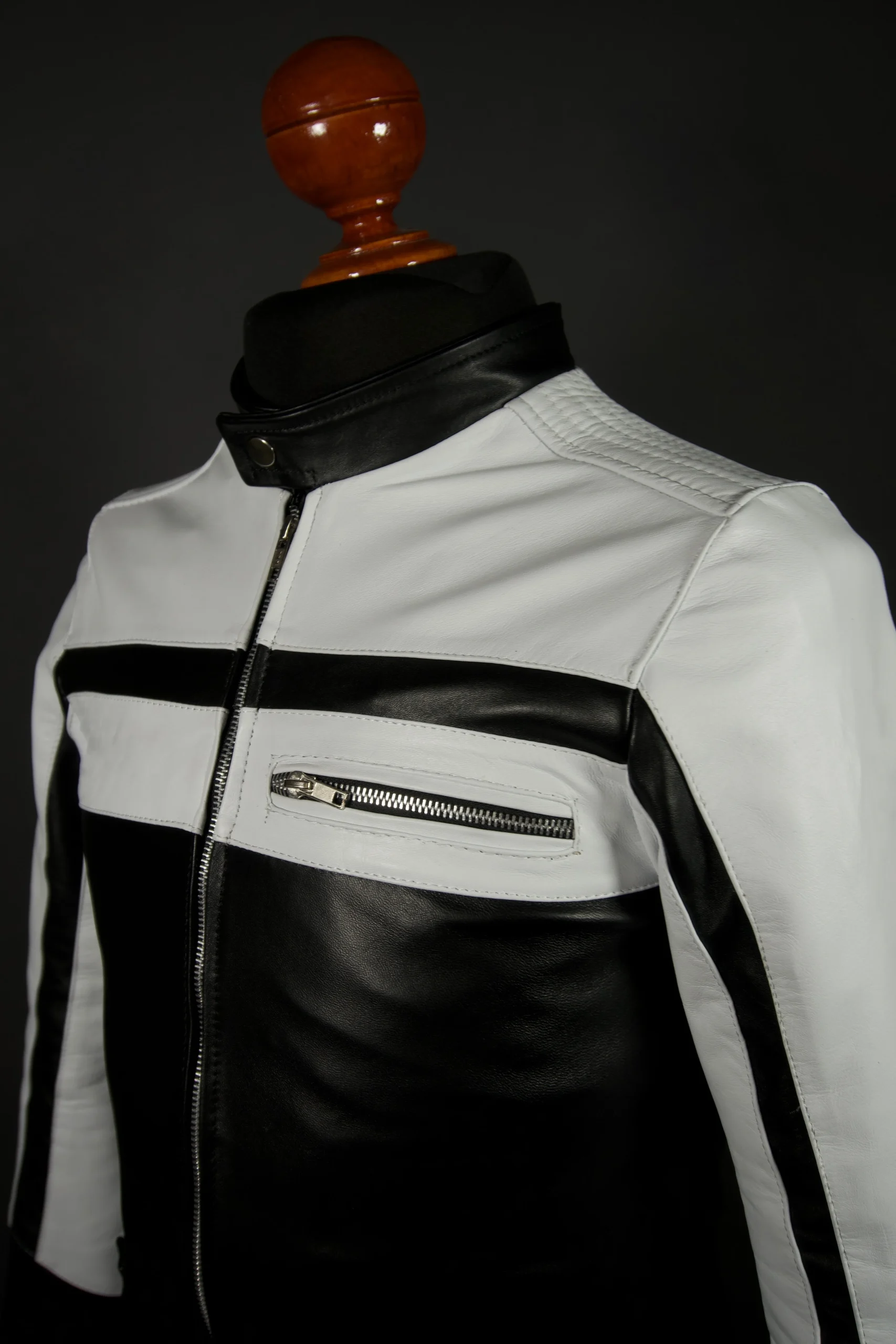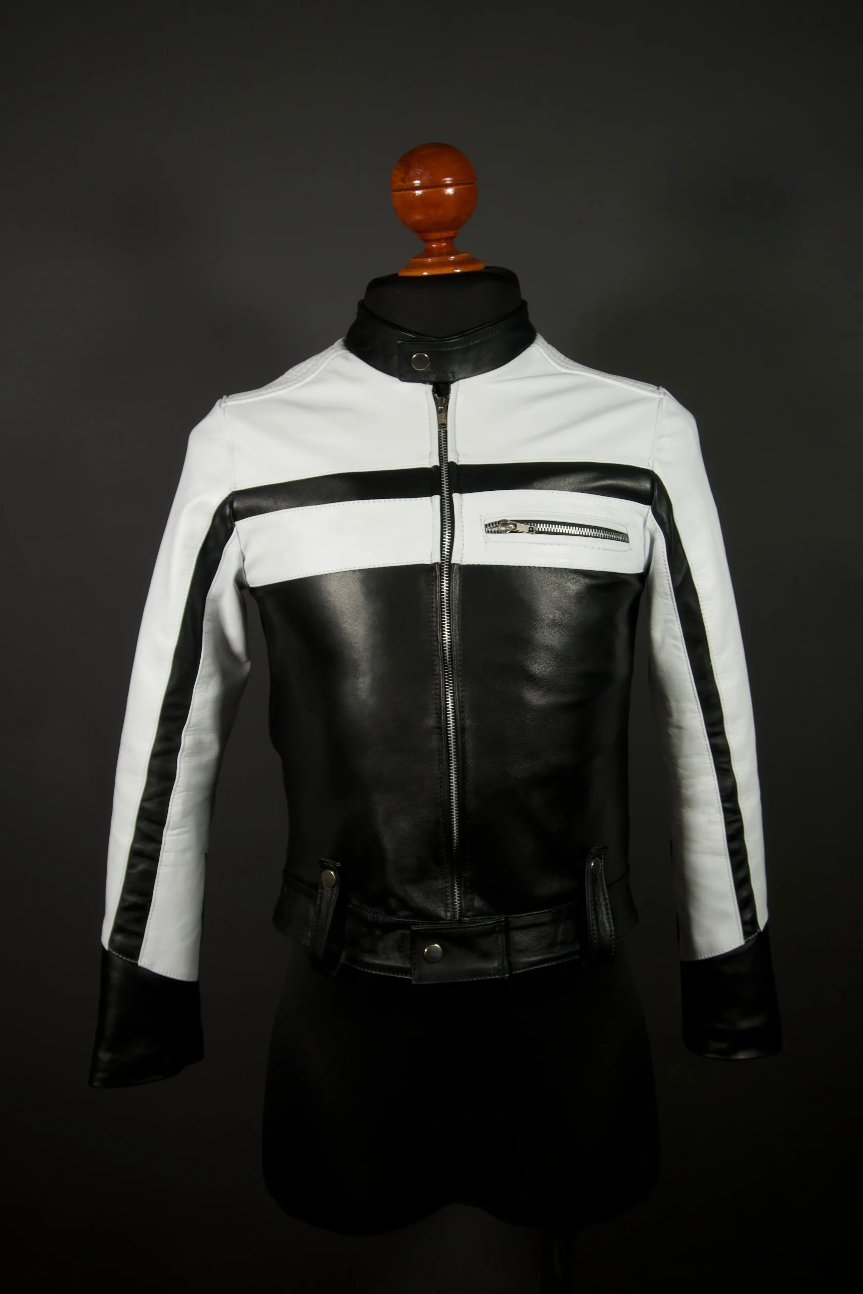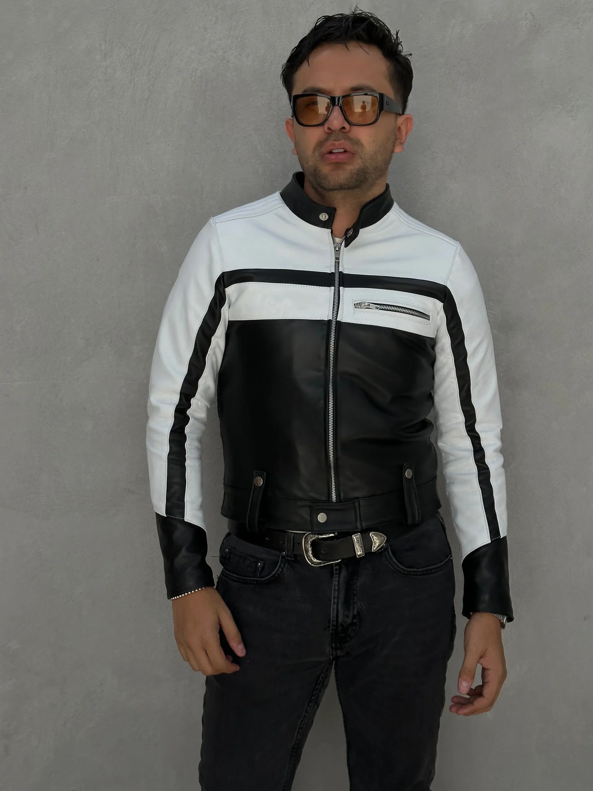 La chamarra Eren Black & White es elaborada con un corte racer croped y piel genuina de primera calidad. Cuenta además con detalles en los puños y la parte inferior de la prenda, para un look único. Esta chaqueta te ofrece el diseño característico de una chaqueta Racer, con un acabado innovador.