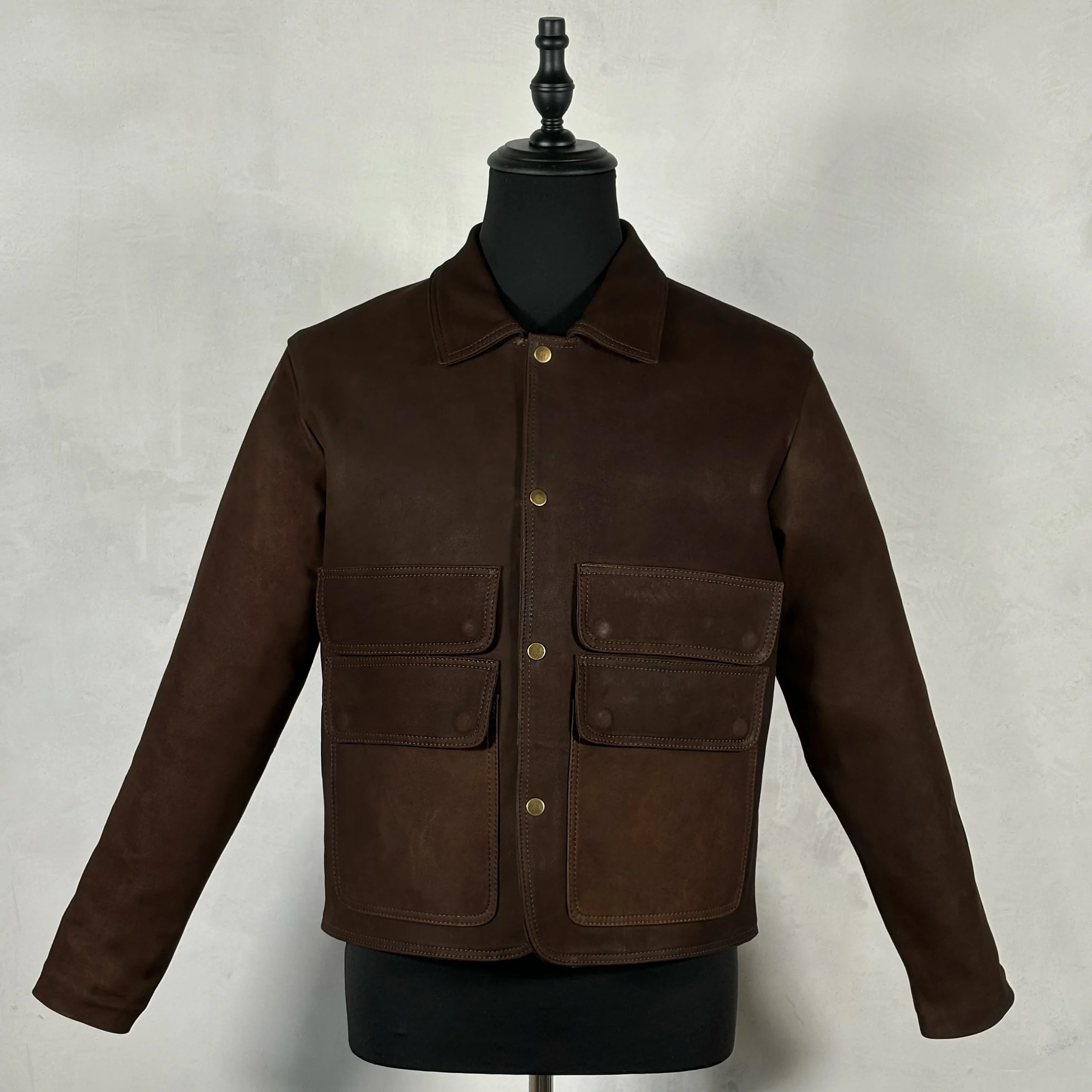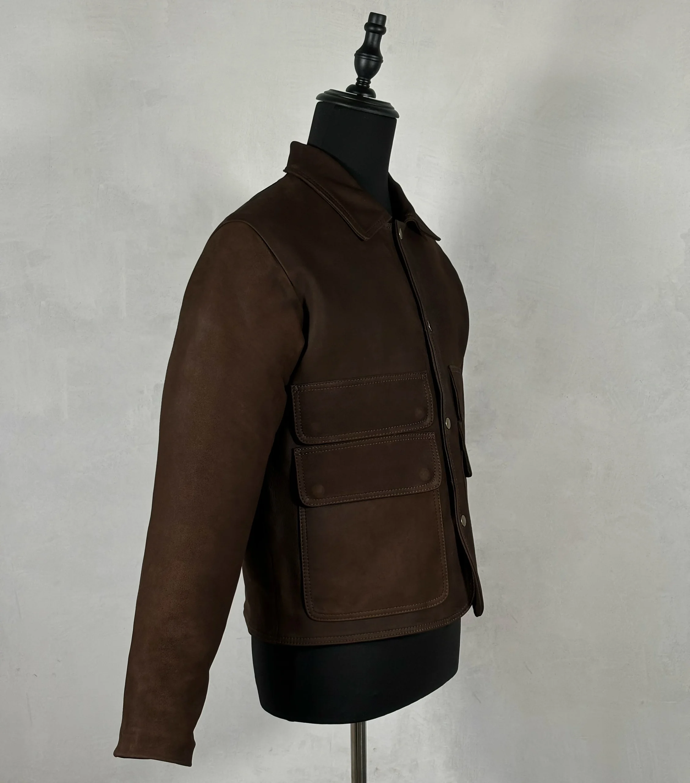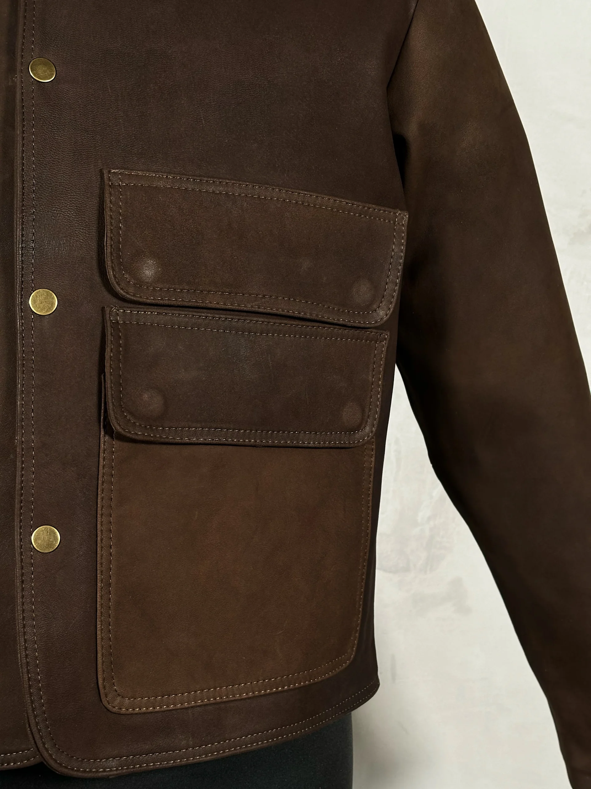 Chamarra de piel nobuck con broches y bolsas de cartera