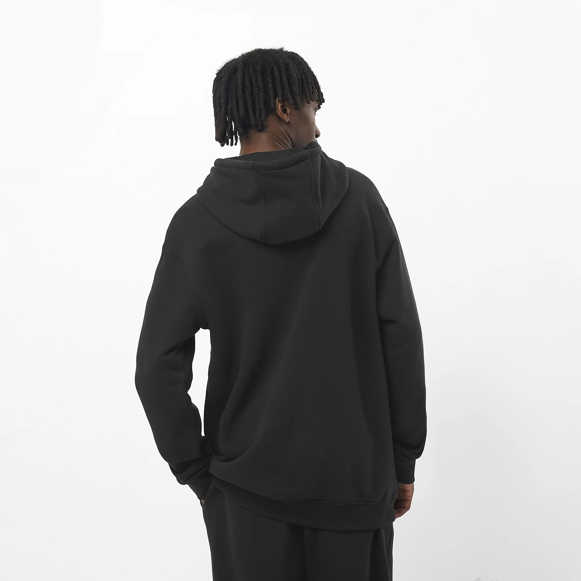 Buzo frisado con logo estampado en el pecho, bolsillo canguro y capucha.