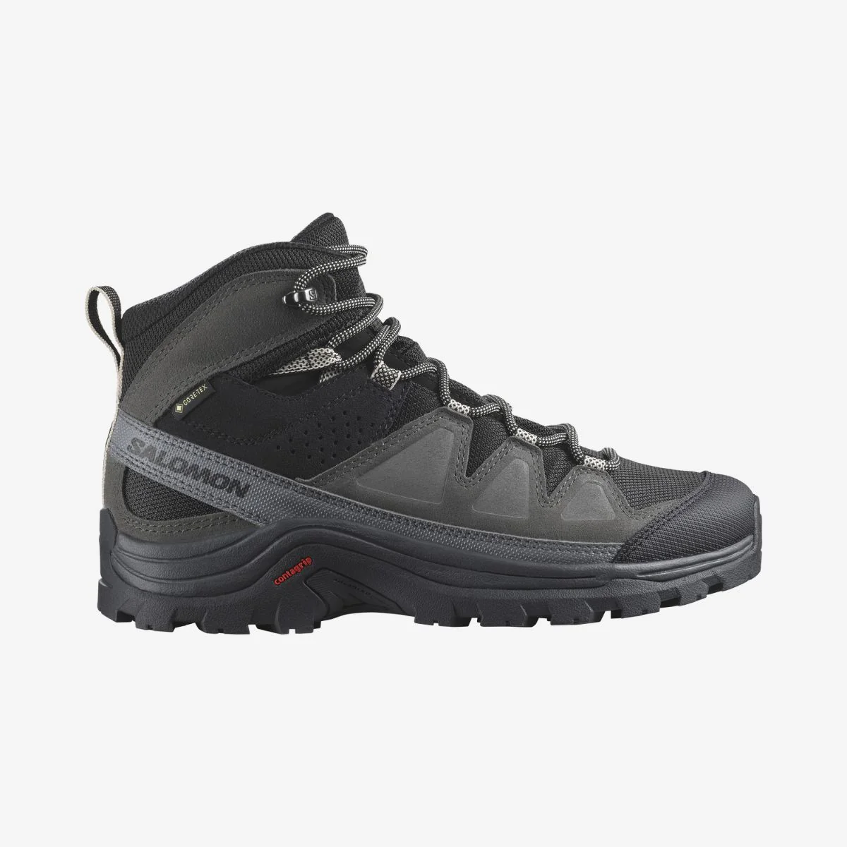 Calzado resistente pensado para largas distancias: cuero entero, GORE-TEX y la unidad inferir contrastada de Salomon.