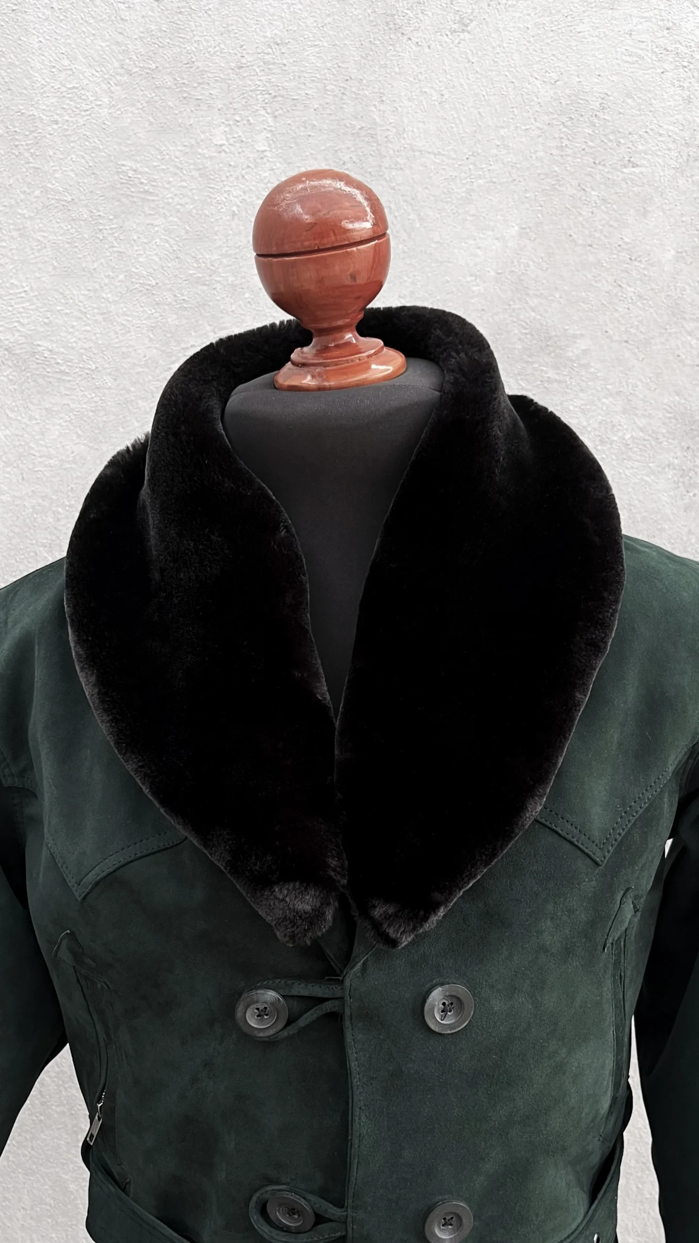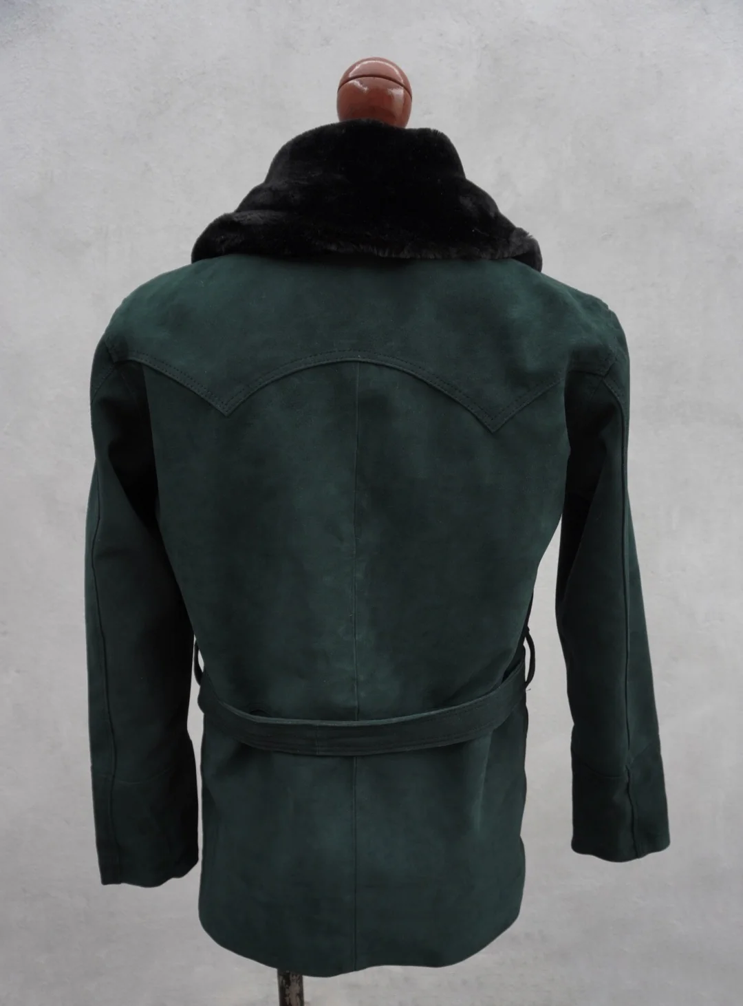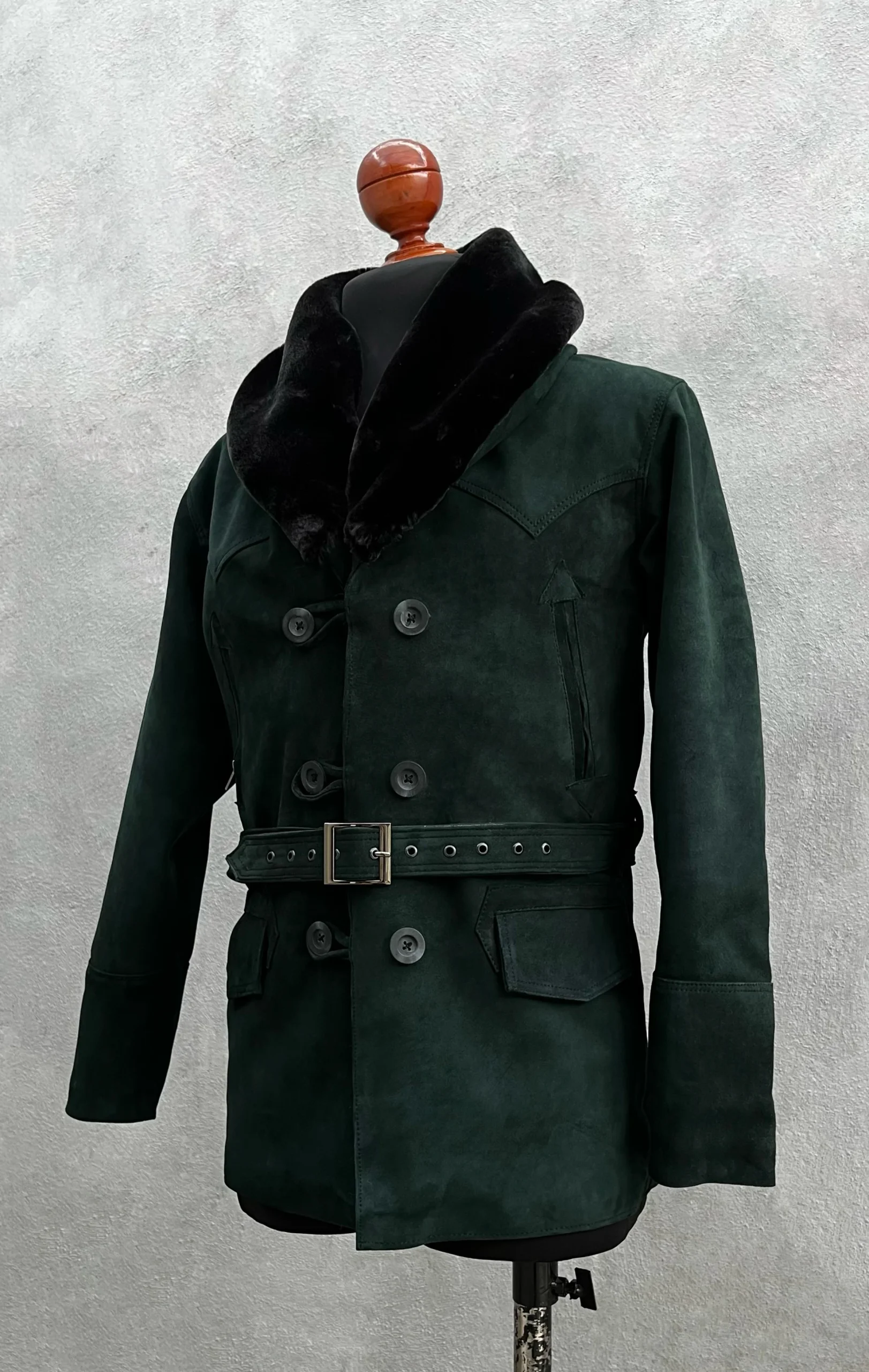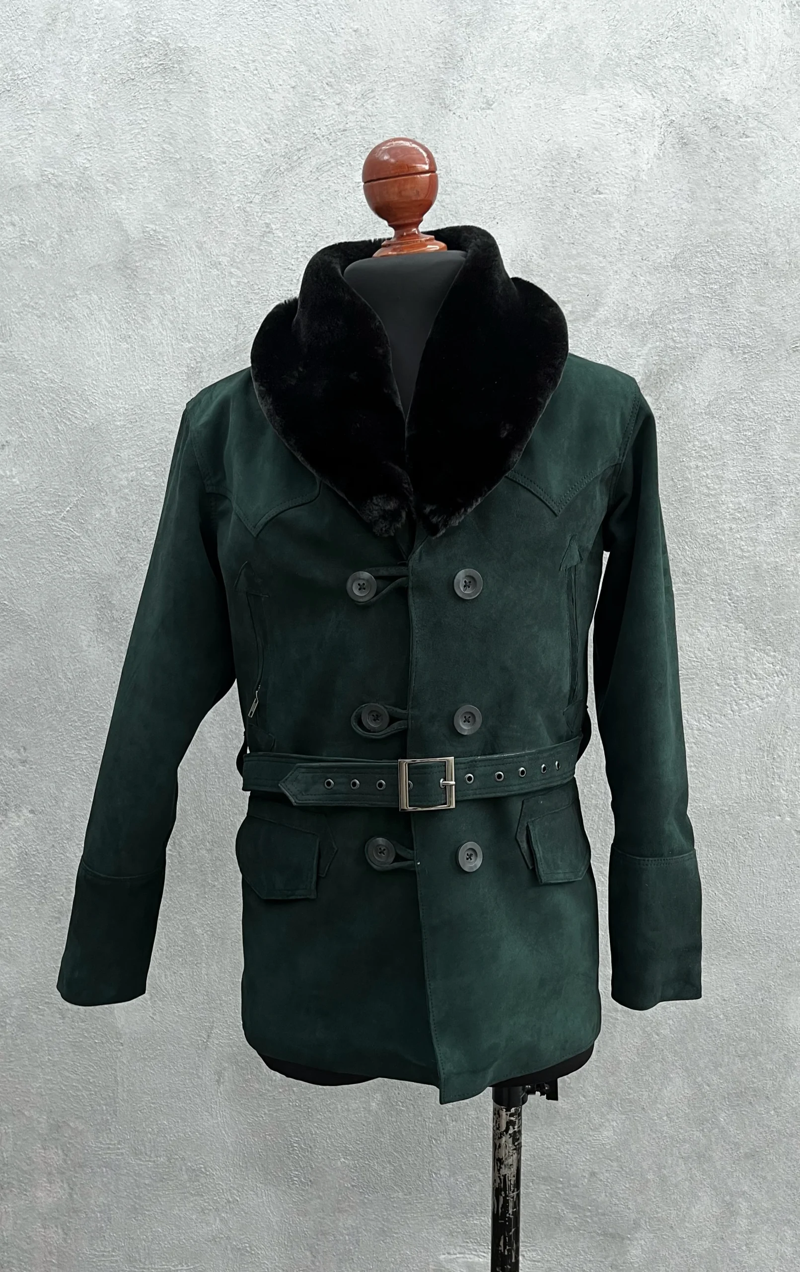 La Roosvelt gamuza verde es una gabardina de piel corta y duradera con un cuello de peluche tejido negro. Con su suave y cómodo material, esta prenda de moda le da a su look una versatilidad moderna.